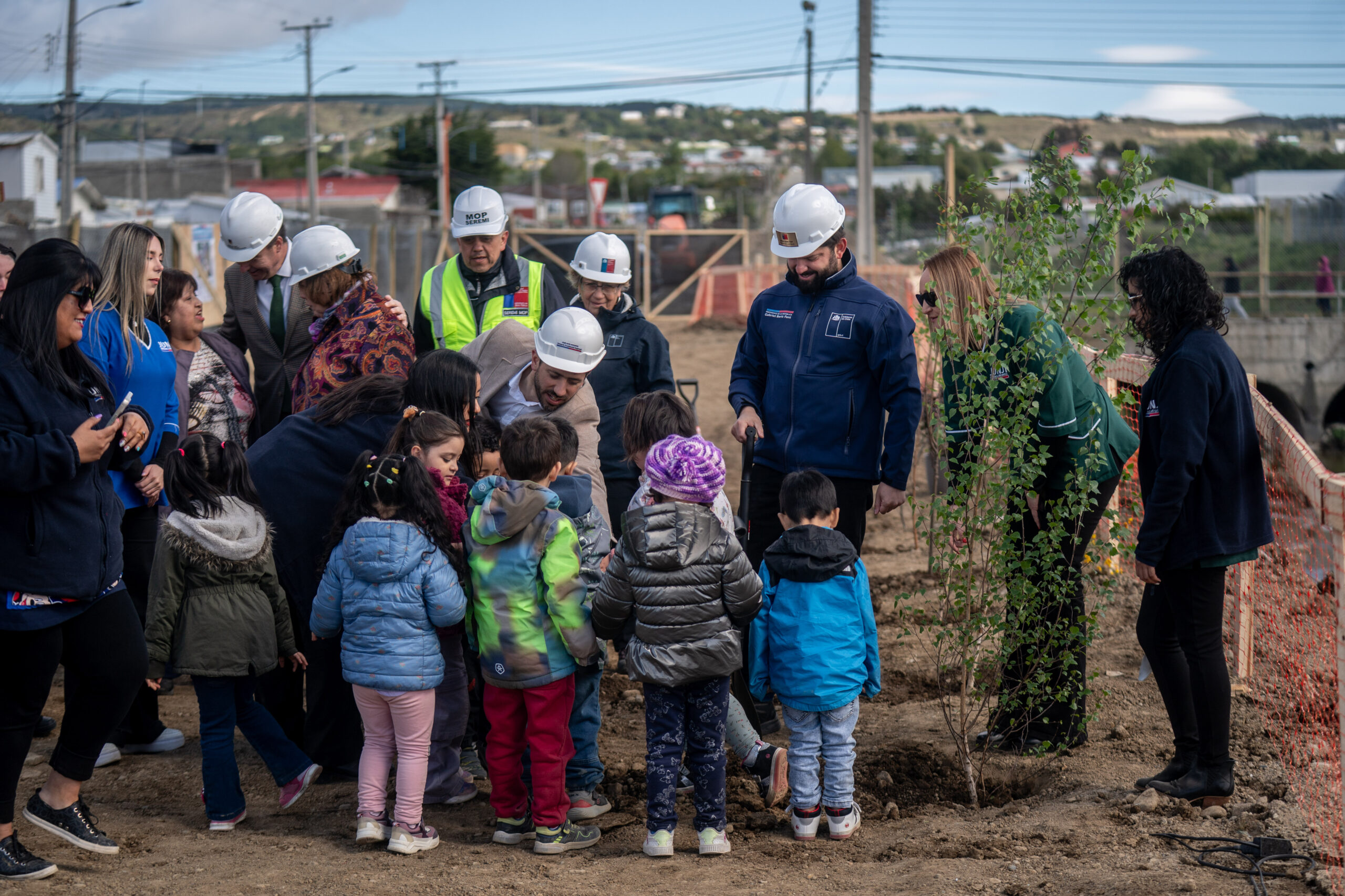 El mandatario, acompañado de la ministra de Obras Públicas, Jessica López; el gobernador de la Región de Magallanes y de la Antártica Chilena, Jorge Flies; y el delegado presidencial regional, José Ruiz; realizó un recorrido que comenzó con una explicación del detalle de las obras, para posteriormente junto a la comunidad del jardín infantil Villa Austral, plantar árboles que simbolizan la próxima transformación de los terrenos en los que hasta ahora abundan microbasurales.